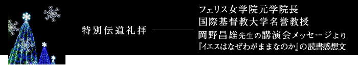 2013年3月10日礼拝後の午後のひと時、フェリス女学院の学院長であり、哲学者の岡野 昌雄先生をお迎えし、「生きる事と考える事」と題した伝道講演会の機会を持つ事が出来ました。今回岡野先生をお招きするにあたり、事前に教会では会員に向け先生がご執筆された「イエスはなぜわがままなのか」と言うタイトルの書籍が紹介されました。